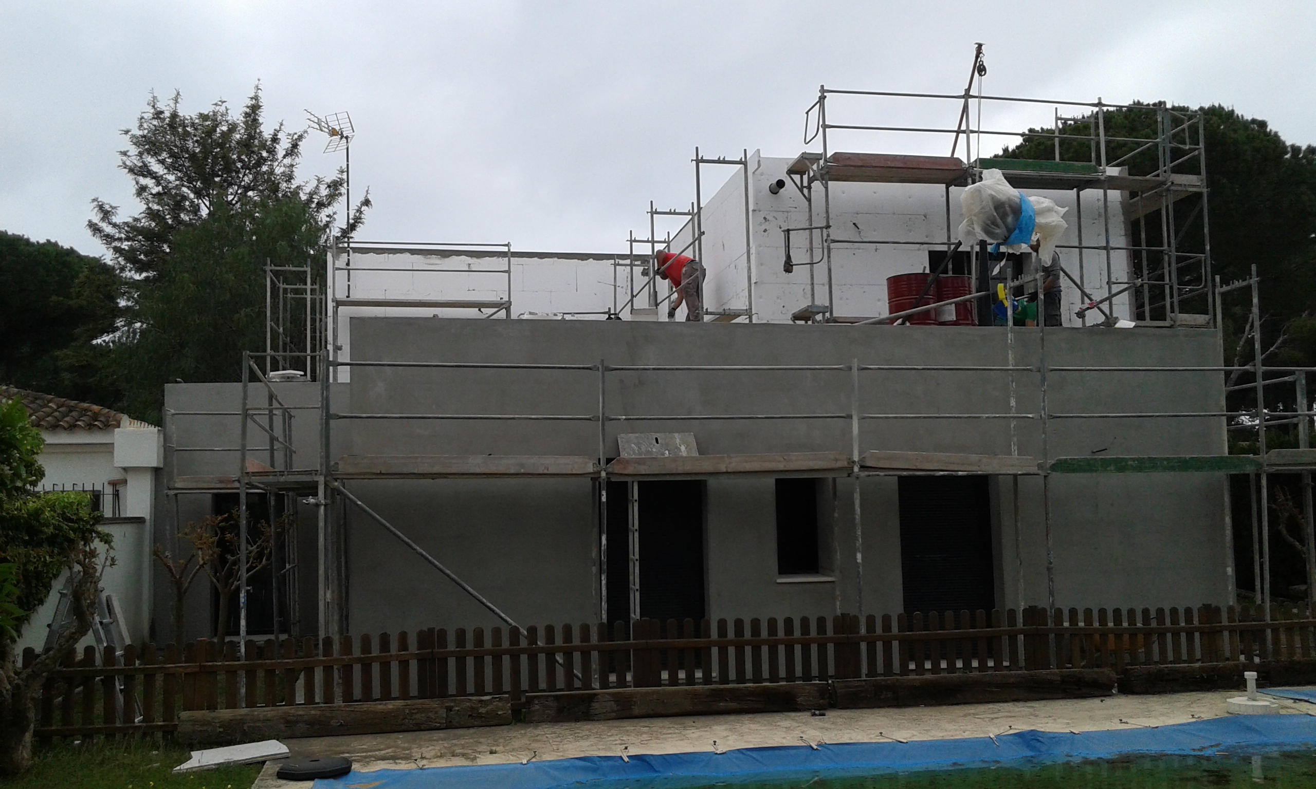 Estamos ejecutando las obras de mejoras y ampliación de Chalet, una de ellas es la mejora de la Eficiencia Energética de la Vivienda, para lo cual se ha optado por utilizar el sistema weber.therm etics acabado acrílico, sistema de aislamiento térmico por el exterior en fachada, utilizando placas aislantes de poliestireno expandido (EPS) estabilizadas, weber.therm placa EPS, con Euroclase E de reacción al fuego, y conductividad térmica 0.037 W/m·K de espesor 40 mm. en general y 20 mm. en mochetas y acabado con mortero acrilico.